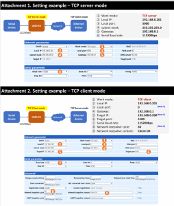 [Tip 4] If you change “Work mode” to “TCP client”, an advanced setting window will open where you can set more parameter. For details, refer to “Attachment 2”